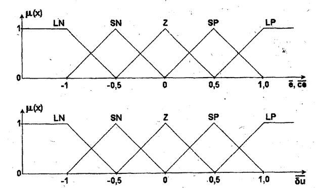 Для рассматриваемого здесь примера синтеза нечеткого регулятора можно принять следующую форму функций принадлежности (рис. 3.6).