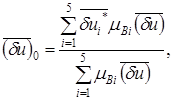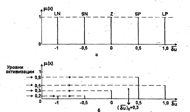 где  - функции принадлежности одному из одноточечных нечетких подмножеств  (т.е. LN, SN, Z, SP.XP);  - числа носители этих подмножеств. Для рассматриваемого на рис, 3.8, б случая имеем