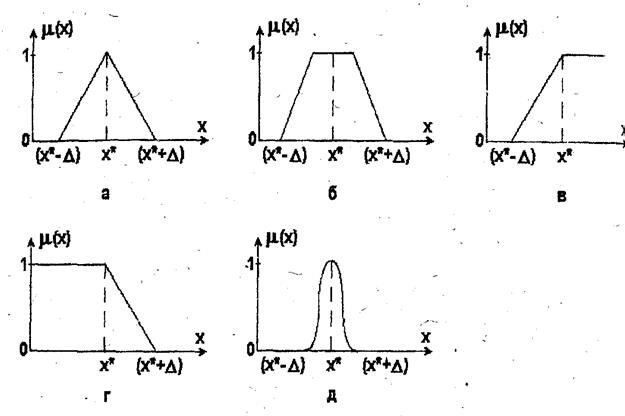 Существуют стандартные формы задания функций принадлежности (рис. 3.5): треугольная (а), трапецеидальная (б), S - типа, или функция "фильтра" (в), Z - типа (г), колоколообразная (д).