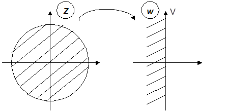 Отметим также еще одно замечательное свойство билинейного преобразования.Оно заключается в том, что при таком преобразовании внутренняя часть круга единичного радиуса на плоскости z отображается на левую полуплоскость плоскости w (рис.9.1).