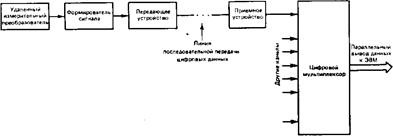 Параллельное преобразование. При параллельном способе сбора данных для каждого канала используется отдельный АЦП (рис. 5.14). Преимущества такого подхода проявляются в промышленных системах сбора данных, когда измерительные преобразователи распределены по большой площади и, как правило, работают в условиях сильных внешних помех. Установка АЦП вблизи измерительных преобразователей и передача преобразованных данных в цифровой форме предотвращают прохождение аналоговых сигналов через области действия помех. При таком подходе обеспечивается также гальваническая развязка и исключается появление земляных контуров (принципы реализации интерфейса для таких систем обсуждались в разд. 5.3).