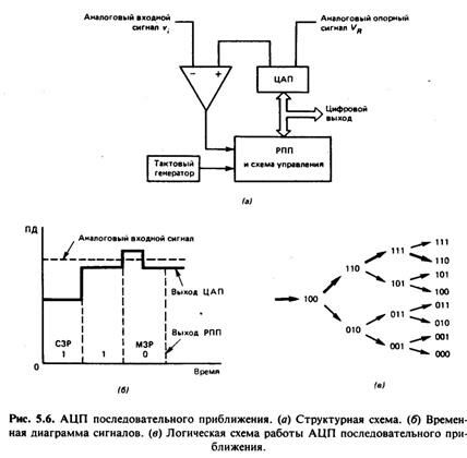 На рис. 5.6 показана базовая функциональная схема 3-разрядного АЦП последовательного приближения с иллюстрацией принципа ее работы. Преобразование всегда начинается с установки единичного значения СЗР в РПП.