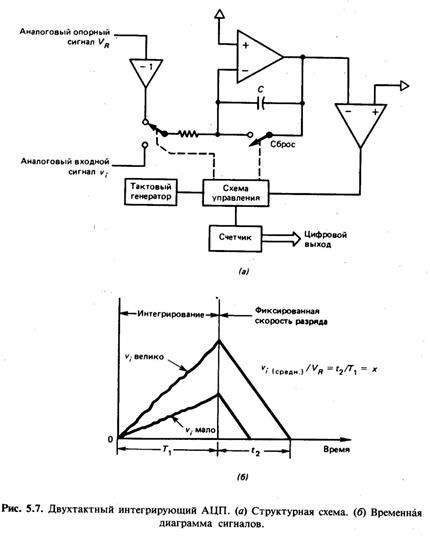Главный недостаток двухтактного интегрирующего АЦП — низкое быстродействие. Например, если Т1 выбирается из условия ослабления сетевых наводок с частотой 60Гц и их гармоник, то минимальное возможное значение Т1 будет равно 16,67 мс. Поскольку время преобразования может вдвое превышать эту величину, то производительность преобразователя ограничена 30 отсчетами в секунду; такая производительность слишком мала для любой быстродействующей системы сбора данных. Двухтактные интегрирующие преобразователи широко используются в измерительных устройствах с отображением информации на цифровых индикаторных панелях, в цифровых мультиметрах и термометрах и в других аналогичных устройствах, где допустима низкая скорость отсчетов.