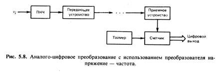На рис. 5.8 представлена схема метода аналого-цифрового преобразования с использованием преобразования напряжения в частоту. Аналоговое входное напряжение преобразуется с помощью прецизионного преобразователя напряжение — частота (ПНЧ) в последовательность импульсов, частота которых пропорциональна величине этого напряжения. Затем счетчик формирует выходное цифровое слово путем подсчета этих импульсов в течение фиксированного интервала времени. Заметим, что входной сигнал эффективно интегрируется в этом интервале. Как и метод двухтактного интегрирования, данный метод преобразования характеризуется низким быстродействием, но хорошей помехоустойчивостью.