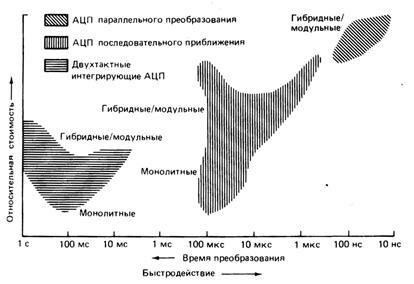 Аналого-цифровые преобразователи. Фирмы, выпускающие АЦП, предлагают устройства с очень широким диапазоном рабочих параметров. Используемый метод преобразования (последовательного приближения, двухтактного интегрирования, параллельного преобразования или какой-либо другой из рассмотренных в разд. 5.2) и технология изготовления схемы (монолитная, гибридная, модульная) определяют наиболее существенные характеристики АЦП – быстродействие, разрешение, стоимость. Диапазоны изменения некоторых характеристик серийно выпускаемых АЦП разного типа представлены на рис. 5.15.