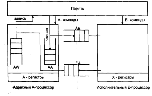 Условно эти подпроцессоры называются адресным А-процессором и исполнительным Е-процессором. А- и Е-процессоры имеют собственные наборы регистров АО,А1,... и ХО,Х1,..., соответственно и наборы команд. А-процессор выполняет все адресные вычисления и формирует обращения к памяти по чтению и записи. А-процессор является обыкновенным целочисленным процессором, поэтому он способен выполнять произвольные целочисленные преобразования, не связанные с вычислением адресов. Е-процессор реализует вычисления с плавающей точкой.