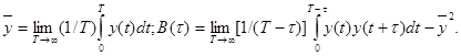 Отметим особенности фиксации и обработки результатов моделирования, связанные с оценкой характеристик стационарных случайных процессов, обладающих эргодическим свойством. Пусть рассматривается процесс у (t). Тогда с учетом этих предположений поступают в соответствии с правилом: среднее по времени равно среднему по множеству. Это означает, что для оценки искомых характеристик выбирается одна достаточно продолжительная реализация процесса y(t), для которой целесообразно фиксировать результаты моделирования. Для рассматриваемого случая запишем математическое ожидание и корреляционную функцию процесса: