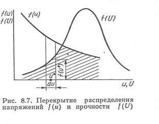 Область перекрытия кривых f(U) и f(u), показанная штриховкой на рисунке, характеризуется определенной вероятностью отказа. Рассмотрим небольшой интервал du в области перекрытия. Вероятность того, что некоторое значение напряжения находится в этом интервале, равно площади элемента du: