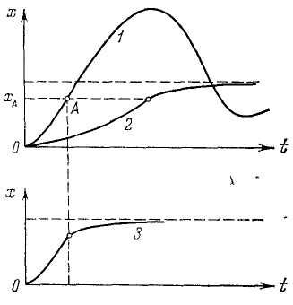 то можно, включив сначала первый закон, переключить затем систему на второй закон в некоторой точке А, когда отклонение х достигнет определенного значения хА. В результате процесс регулирования изобразится кривой 3 (рис. В.7), объединяющей оба качества — быстроту и плавность процесса.