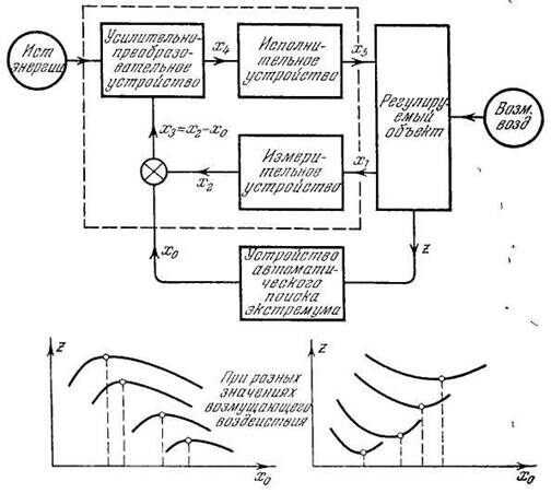 В отличие от них экстремальными системами регулирования называются такие, которые сами ищут наивыгоднейшую программу, т.е. то значение регулируемой величины, которое нужно в данный момент выдерживать, чтобы режим работы регулируемого объекта был наивыгоднейшим. При этом имеется в виду уже не выбор закона регулирования, а автоматический поиск требуемого наивыгоднейшего значения регулируемой величины при изменяющихся внешних условиях работы объекта. Таким образом, на систему называемую экстремальной, сверх обычной задачи автоматического выдерживания требуемого значения регулируемой величины, накладывается дополнительная задача автоматического поиска наивыгоднейшего значения требуемой регулируемой величины, т.е. самой программы регулирования.