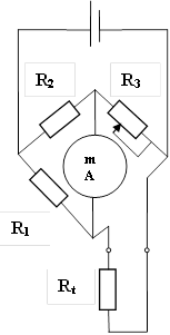 Уравновешенный мост представляет собой схему (Рисунок 34, а), состоящую из ромба, образуемого четырьмя сопротивлениями R1 R2, R3, Rt. Резисторы в схеме называют ветвями или плечами моста. Помимо этого в мостовую схему включены источник тока со своим сопротивлением RE и измерительный прибор с сопротивлением Rnp. В четырехугольнике также есть две диагонали, в одну из которых включен миллиамперметр, а в другую - источник тока. Для подстройки моста одно плечо (R3) является переменным сопротивлением.