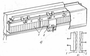 Линейный индуктосин (Рисунок 17) состоит из набора измерительных шкал 1 и ползуна 2, монтируемых на рабочих органах. Измерительная шкала индуктосина укреплена на неподвижной части и представляет собой стальную линейку, на которой на соответствующую изолирующую подложку печатным способом нанесена зигзагообразная обмотка с шагом 2 мм. Ползун 2, укрепленный на подвижной части, является якорем и состоит из двух таких же, но более коротких обмоток, сдвинутых на 1/4 шага относительно друг друга. На выходе обмоток якоря индуцируется циклический сигнал. Число циклов определяется числом пройденных шагов. В промышленности применяют также круговые индуктосины.