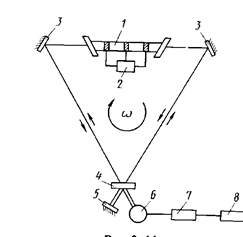 , вектор которой перпендикулярен к плоскости контура, приводит к тому, что интерференционные полосы начинают перемещаться относительно фотокатода со скоростью вращения корпуса. Это обстоятельство связано с тем, что при вращении вследствие появления разности времен хода лучей, распространяющихся по оптическому замкнутому контуру в противоположных направлениях, появляется и разность их хода, т.е. как бы разность длин периметра резонатора, по которому они распространяются. При генерации в КОКГ длины волн должны уложиться в теперь уже разных периметрах одинаковое целое число раз, поэтому эти длины, а следовательно, и частоты электромагнитных колебаний при наличии