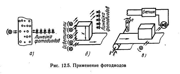 Линейку фотодиодов используют для измерения размеров детали, перемещаемой на конвейере. Деталь перекрывает световой поток (рис. 12.5, б) и затемняет такое количество фотодиодов, которое соответствует высоте детали.