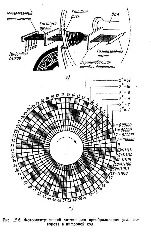 Рассмотрим применение фотоэлектрических датчиков для преобразования угла поворота в цифровой код (рис. 12.6, а, б). Осветитель направляет световой поток через прозрачный диск, на который фотохимическим способом нанесена кодовая шкала с прозрачными и непрозрачными участками. С другой стороны диска расположены фотоприемники, количество которых равно числу разрядов двоичного числа. На рис. 12.6 показан кодовый диск с шестью разрядами. Самый старший разряд расположен ближе всего к центру диска. Прозрачный участок означает двоичную цифру «1», непрозрачный — двоичную цифру «О». Если во всех разрядах стоит «О», то это двоичный код числа 0. Если во всех разрядах стоит «1», то это двоичный код десятичного числа 63 (1111112= =6310). Свет, проходя через кодовый диск, попадает на фотоприемники. Наличие выходного сигнала с фотоприемника принимается за «1», отсутствие — за «0». Такое устройство называется аналого-цифровым преобразователем или кодовым датчиком.