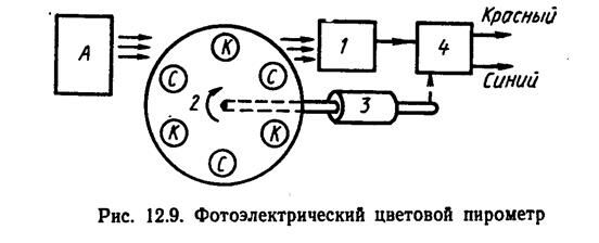 На рис. 12.9 показана схема фотоэлектрического цветового пирометра. Излучение от объекта измерения А поступает на фотоэлемент 1 через диск 2, в котором попеременно расположены красные и синие светофильтры. Диск приводится во вращение с постоянной скоростью электродвигателем 3. Таким образом, на фотоэлемент попеременно попадают то красные, то синие лучи. Синхронно с вращением диска 2 усиленный сигнал с фотоэлемента переключается коммутатором 4, выделяющим два сигнала: соответствующий интенсивности красных лучей и соответствующий интенсивности синих лучей. Измеритель отношения сигналов (например, логометрического типа) проградуирован в единицах температуры.