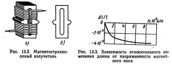 Если стержень из ферромагнитного материала находится в пе­ременном магнитном поле, то он будет попеременно сжиматься и разжиматься, т. е. деформироваться. Зависимость относительного изменения длины  стержня из никеля от напряженности маг­нитного поля Н показана на рис. 13.3. Так как знак деформации не зависит от направления поля, то частота колебаний деформа­ции будет в два раза больше частоты переменного возбуждающе-