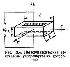 В пьезоэлектрическом излучателе ультразвуковых колебаний используется пластина кварца (рис. 13.4), к которой приложено переменное напряжение Uх, создающее электрическое поле в на­правлении электрической оси X (см. рис. 7.1). Продольный обрат­ный пьезоэффект заключается в деформации пластины по оси X.