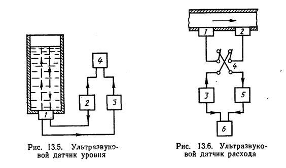 уровня является время распространения колебании от источника излучения к границе раздела и обратно к приемнику. Эти величи­ны уровня и времени связаны между собой соотношением (13.1). Благодаря свойству ультразвуковых колебаний распространяться в любых упругих средах между излучателем и измеряемой средой может находиться металлическая стенка, что позволяет вести изме­рение без контакта измерительных элементов с контролируемой средой и без электрических вводов в резервуар.