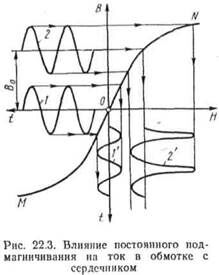 видно, что при подмагничивании сердечника постоянным током, т. е. при наличии постоянной составляющей магнитной индукции