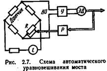 снимается с измерительной диагонали моста и подается на исполнительный микроэлектродвигатель (ЭД) через усилитель (У). Двигатель через редуктор (Р) перемещает движок переменного резистора R до тех пор, пока не будет обеспечено условие равновесия и напряжение разбаланса