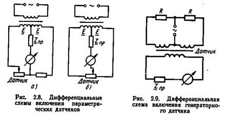 Дифференциальная схема состоит из двух смежных контуров с источником питания, а измерительный прибор включен в общую ветвь контуров и реагирует на,разность контурных токов. В дифференциальной схеме могут быть использованы как параметрические датчики (с изменяющимися сопротивлениями), так и генераторные (с изменяющейся ЭДС). Дифференциальные схемы включения параметрических датчиков показаны на рис. 2.8 (а — датчик включен в один контур; б — датчик включен в оба контура). ЭДС, питающие оба контура, одинаковы. Дифференциальная схема включения генераторного датчика показана на рис. 2.9. В этой схеме датчиком является так называемый дифференциальный трансформатор (подробно рассмотрен в § 6.4). При изменении магнитной связи между обмотками трансформатора ЭДС левого контура, например, возрастает, а правого — уменьшается. Изменение магнитной связи обусловлено контролируемой неэлектрической величиной. Например, оно может быть вызвано перемещением ферромагнитного сердечника в дифференциальном трансформаторе.