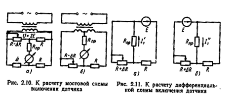 Проведем сравнение дифференциальной и мостовой измерительных схем по чувствительности. В обеих схемах (рис. 2.10, а, 6) будем использовать одинаковые датчики с изменяющимся активным сопротивлением