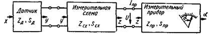 Итак, от датчика получен электрический сигнал, несущий информацию о неэлектрической величине. Этот сигнал представляет собой изменение активного сопротивления, или индуктивности, или напряжения, или тока, или какого-либо другого электрического параметра. Чтобы измерить этот параметр, нужен соответствующий электроизмерительный прибор. А для согласования сигнала датчика с электроизмерительным прибором необходима измерительная схема. Таким образом, схема электрического измерения неэлектрической величины может быть представлена на рис. 2.1. Каждый элемент схемы обладает чувствительностью S и сопротивлением Z. Все они могут питаться от источника электроэнергии (на рис. 2.1 источник питания не показан). Датчик преобразует входную неэлектрическую величину х в электрический параметр у (сопротивление, напряжение или др.). Чувствительность датчика