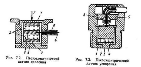 На рис. 7.3 показан пьезоэлектрический датчик ускорения, используемый в виброизмерительной аппаратуре. Пьезоэлемент 1 из титаната бария расположен в корпусе прибора 2 между инерционной массой 3 и подпятником 4. Для увеличения силы, действующей