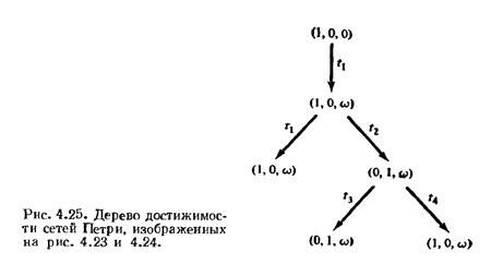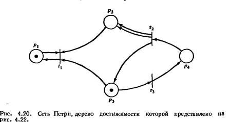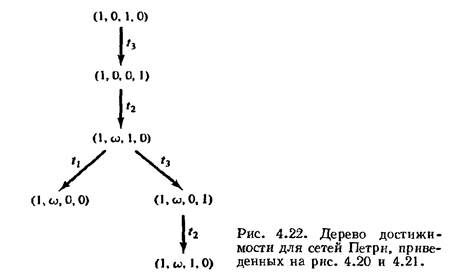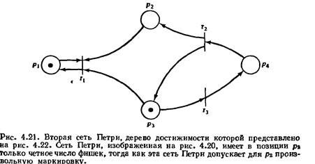 Рассмотрим, например, сети Петри на рис. 4.20 и 4.21, дерево достижимости которых изображено на рис. 4.22. Одно дерево достижимости представляет эти две схожие (но различные) сети Петри. Множества же достижимости их не совпадают. В сети Петри на рис. 4.20 число фишек в позиции р2 всегда четно (пока не будет запущен переход t1), тогда как в сети Петри на рис. 4.21 оно может быть произвольным целым. Символ t0 не позволяет обнаруживать информацию такого рода, препятствуя использованию дерева до­стижимости для решения задачи достижимости.