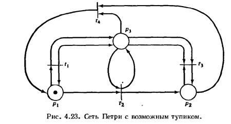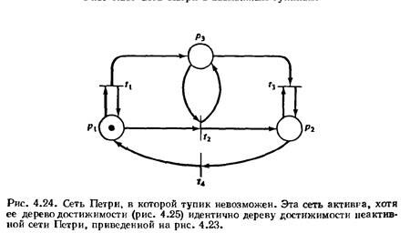 Аналогичная трудность существует и для задачи активности На рис. 4.23 и 4.24 приведены две сети Петри, дерево достижимости которых изображено на рис. 4.25. Однако сеть на рис. 4.23 может иметь тупик (например, в результате последовательности t1 t2 t3 )  а сеть Петри с рис. 4.24 — нет. Дерево достижимости же вновь не может передать различие этих двух случаев.