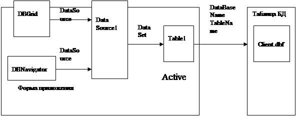 Компонент DBGrid1 отображает содержимое таблицы БД в виде сетки, в которой столбцы соответствуют полям, а строки — записям таблицы. По умолчанию пользователь может просматривать и редактировать данные. Компонент DBNavigator1 позволяет пользователю перемещаться по таблице, редактировать, вставлять и удалять записи. Компоненты DBGrid1 и DBNavigator1 связываются со своим источником данных -компонентом DataSourse1 через свойства DataSourse. Взаимосвязь компонентов приложения и таблицы БД и используемые при этом свойства компонентов показаны на рис. 3.