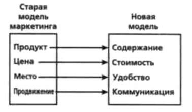 В экономике, которая во многом зависит от Интернет, секрет успеха кроется в том, чтобы суметь «зацепить», удержать внимание потребителя. В наш век четыре традиционных элемента маркетинга (товар, цена, место и продвижение) уступят место новым — содержанию, себестоимости, удобству и коммуникации. Эти четыре элемента нацелены на покупателя, а не на товар, как раньше. На рисунке 6.3 представлено сопоставление старой и новой моделей маркетинга, причем это относится как к товарам и услугам, так и к манере их представления.