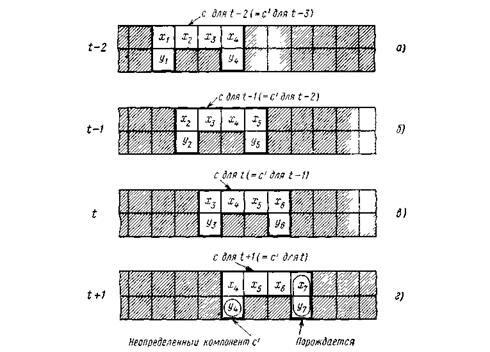 Иллюстрацией к доказательству того, что маски с «пробелами» недопустимы в ST-системах, служит рис. 4.10; компонент следующего состояния с' при значении параметра t+1 не может быть ни определен из состояния с в момент времени t (рис. 4.10,в), ни порожден с помощью ST-функции, так как уже порожден при значении параметра t—3 (рис. 4.10,а).