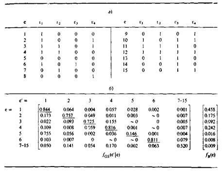 описывает работу ЦП, а остальные три переменных — работу трех важных каналов связи системы. Для получения вероятностной ST-функции из этого огромного набора данных, превышающего 1,6 млн. бит, с помощью маски без памяти была сделана выборка для двух последовательных состояний. Это дало 15 состояний (см. табл. 4.2,а) и 11З переходов. Состояния 7—15 появляются очень редко: вероятность того, что система находится в одном из этих состояний 0.009. Если для упрощения ST-функции, объединить эти состояния в одно, что удобно для исследователя, получится матричное представление порождающей ST-функции, приведенное в табл. 4.2,б. Элементами матрицы являются условные вероятности