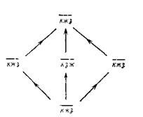 Пример 4.7. Рассмотрим переменную, состояниями которой являются цвета светофора: красный, желтый, зеленый. Поскольку они не упорядочены, все разбиения множества состояний приемлемы в качестве разрешающих форм. Диаграмма Хассе для этой решетки приведена на рис. 4.13. Буквы к, ж, з означают соответственно красный, желтый и зеленый цвета. Группам в отдельных разрешающих формах показаны черточками над соответствующими буквами. Стрелка на диаграмме указывают направление уточнения разбиений. Для упрощения исходной системы нужно двигаться в направлении, обратном стрелкам.
