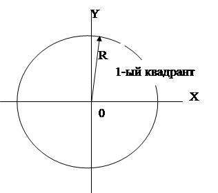 Данный алгоритм обеспечивает формирование дуги окружности с центром в начале координат, расположенной в первом квадранте (Рис. 2.2‑1). Используя зеркальное отображение относительно координатной оси, можно на основании дуги, сформированной для первого квадранта, получить изображение окружности во всех оспальных квадрантах.