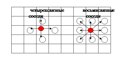 При реализации рассматриваемого способа возможно использование или восьмисвязного, или четырехсвязного соседства, которые поясняются ниже приведенным рисунком (Рис. 4.3‑1).