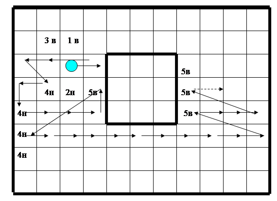 Процесс закраски области данном способом иллюстрируется на ниже приведенном рисунке (Рис. 4.3‑2). На рисунке приведена траектория обработки точек с указанием адресов стека, в которые помещаются их координаты. Закрашенная точка соответствует точке-затравке.
