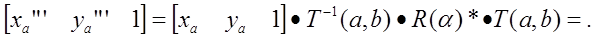 Обозначение матрицы знаком «*» означает использование расширенной матрицы. В выше приведенном выражении матрица R(a), соответствующая повороту относительно начала координат, берется в расширенной форме (добавлены одна колонка и одна строка, имеющие все нулевые элементы, кроме элемента на их пересечении, который равен «1»).