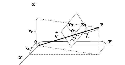 Видовая система координат представляет собой такую трехмерную систему координат с координатными осями Xв, Yв, Zв, которая «удобна» для заданной проекции, т.е. из которой наиболее просто осуществляется переход в двумерную систему на плоскости проекции (например, экран). Для данного вида перспективной проекции начало видовой системы координат должно находиться в точке E, ее ось Zв должна совпадать с вектором проекции V, ее ось Xв должна проецироваться на ось X э, а ее ось Y в должна проецироваться на ось Y э.