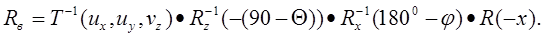 2) поворот полученной системы на угол (-(900-q)) относительно ее координатной оси Z1, в результате чего будет получена система с координатными осями X2, Y2, Z2 (реализуется матрицей Rz-1(-(900-q)), в которой вектор V находится в координатной полскости Y2, Z2 ;