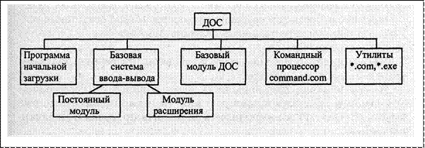 Структурно ОС IBM PC состоит из следующих элементов, представленных на рис. 10.3. Кроме программных компонентов, указанных на рисунке, к ДОС относят еще вспомогательные файлы autoexec.bat и config.sys. Они предназначаются для настройки на конкретные режимы работы.