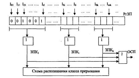 Запросы всех источников прерывания поступают на регистр запросов прерывания РгЗП, устанавливая соответствующие его разряды в состояние 1, указывающее на наличие запроса прерывания определенного источника. Запросы классов прерывания ЗПК1-ЗПКk формируются элементами ИЛИ, объединяющими разряды РгЗП, относящиеся к соответствующим классам (уровням). Еще одна схема ИЛИ формирует общий сигнал прерывания ОСП, поступающий в устройство управления процессора.