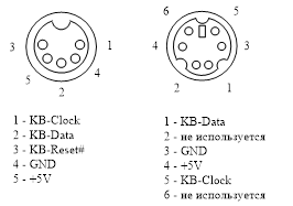 Клавиатура подключается к системному блоку одним из двух видов разъема: обычным 5-контактным (розеткой на системном блоке и вилкой на клавиатуре) DIN, применяемым и в бытовой радиоаппаратуре, или малогабаритным (розеткой на системном блоке) mini-DIN, появившимся в компьютерах семейства PS/2 и получившим аналогичное название. На этот же разъем через плавкий предохранитель поступает и напряжение питания клавиатуры +5 В. Вид разъемов со стороны системного блока и назначение контактов приведены на рисунок 1.46.