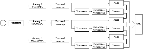 Для получения значений шести спектральных параметров звука (при анализе по методу спектральных характеристик речи) электрический сигнал, полученный с микрофона, пропускается через три полосовых фильтра (рисунок 1.66) с полосами пропускания, равными поддиапазонам речевого спектра. В каждом канале трех поддиапазонов пиковый детектор выделяет максимальное значение амплитуд сигналов за время кванта; аналого-цифровой преобразователь выдает в двоичном коде значение величины выделенной амплитуды. Для обеспечения стабильной работы в схему анализатора введены усилители, охваченные обратной связью, которые осуществляют автоматическую регулировку усиления амплитуды сигнала.