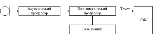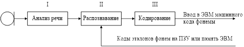 Структура устройств ввода речи. Процесс ввода речи, как процесс распознавания слуховых образов, состоит из трех этапов: анализа, идентификации и ввода в ЭВМ (рисунок 1.67). Основные трудности представляет индивидуальность голоса и слитность речи, что усложняет анализ и идентификацию единиц речи - звуков, фонем, слов.