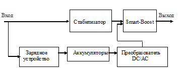 Схема, поясняющая принцип действия ИБП, использующих топологию line-interactive (интерактивные ИБП), приведена на рисунке 1.5. Одним из основных отличий от классической топологии ИБП является Smart-Boost. Это позволяет при кратковременных провалах (brownout) напряжения до 12% от номинального не переходить на питание от аккумуляторов, а “вытягивать” уровень выходного напряжения за счет усиления входного.