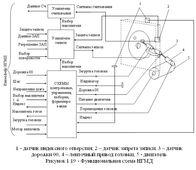 Накопители на гибких магнитных дисках. Устройство (НГМД) (рисунок 1.19) включает ГМД, пять основных систем (приводной механизм, механизм позиционирования, механизм центрования и крепления, систему управления и контроля, систему записи-считывания) и три специальных датчика (датчик индексного отверстия, датчик запрета записи, датчик дорожки 00).
