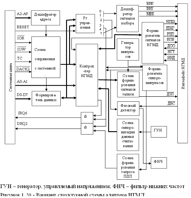 Адаптеры накопителей на гибких магнитных дисках. Адаптер НГМД переводит команды, поступающие из ПЗУ BIOS, в электрические сигналы, управляющие НГМД, а также преобразует поток импульсов, считываемых с дискеты МГ, в информацию, воспринимаемую ПЭВМ. Конструктивно электронное оборудование адаптера может быть размещено на системной плате. Один из вариантов построения структурной схемы адаптера НГМД приведен на рисунке 1.20.